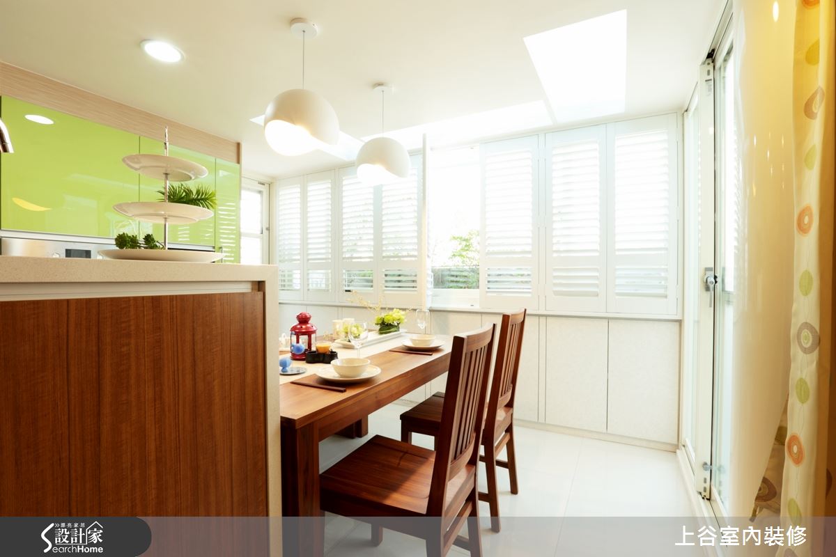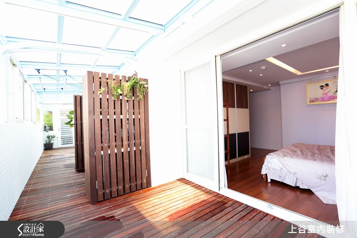 首先,設計師利用單面的直線採光,將居住者平日最長停留的公、私領域循著光線採平行安排,因此從客廳、餐廚區、臥室皆能無礙地享受到自然光的美好,地面使用拋光磚,藉由其特性使空間更加簡潔明亮;根據屋主的需求,屋內大量地使用了木質,替敞亮的環境注入了暖意與溫馨。由於屋主太太希望能有一個吧檯,於是將電視牆結合了吧檯,一方面節省空間,另一方面則是使兩區域自然地有了間隔,餐桌則設置於吧檯旁,臨著窗邊,享用佳餚的同時能享受自然光的洗禮。設計師特意將陽台往外推,給人安定感的實木地板搭上帶有淡淡天藍色的露天玻璃,最後再將盆栽綠意帶進入此,寬敞、不受限的空間,讓它能是孩子的遊戲室,也可以成為屋主自身休憩的區域。