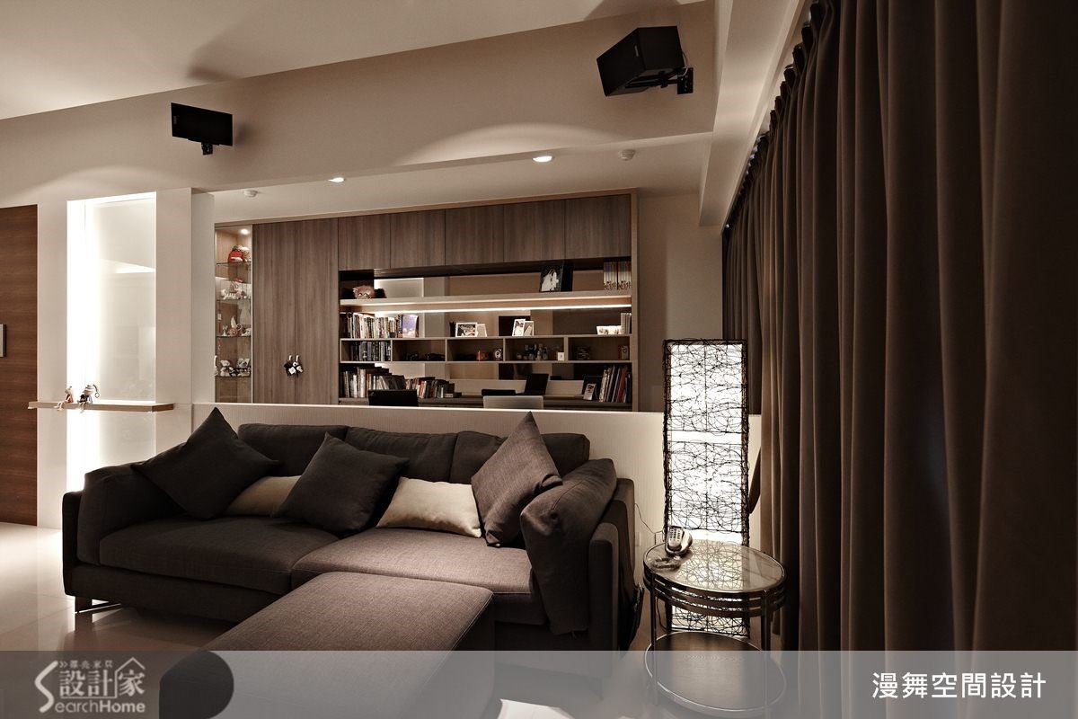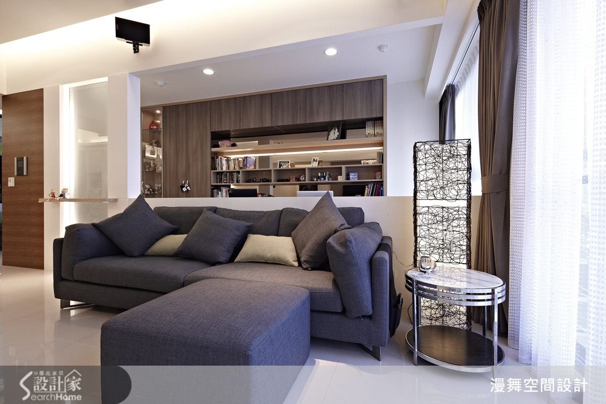客廳與書房之間以矮牆與沙發為分界,除了延伸空間廣度,也能讓屋主隨時留意到孩子在客廳玩耍的情況,增加彼此的安全感。