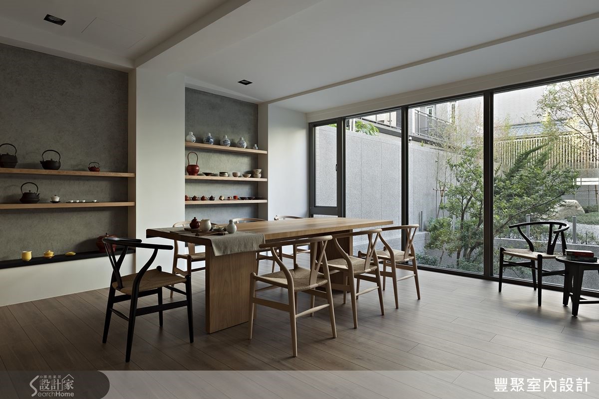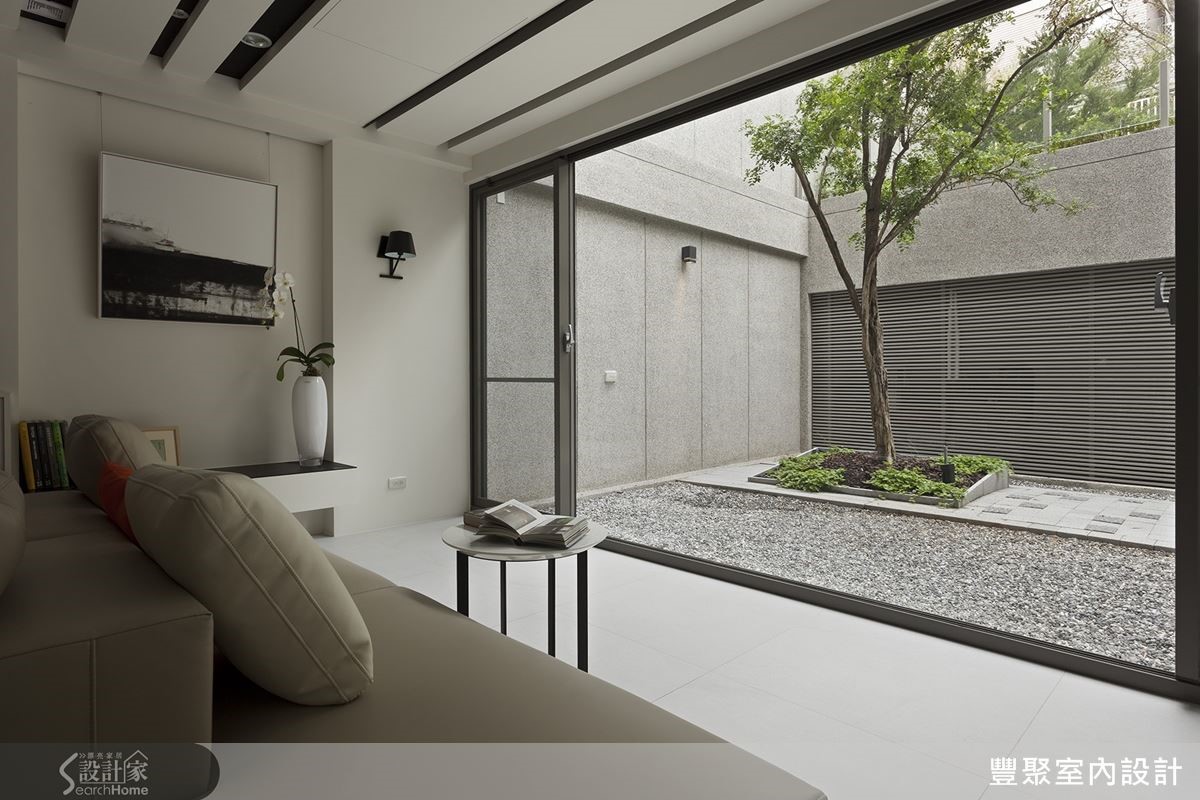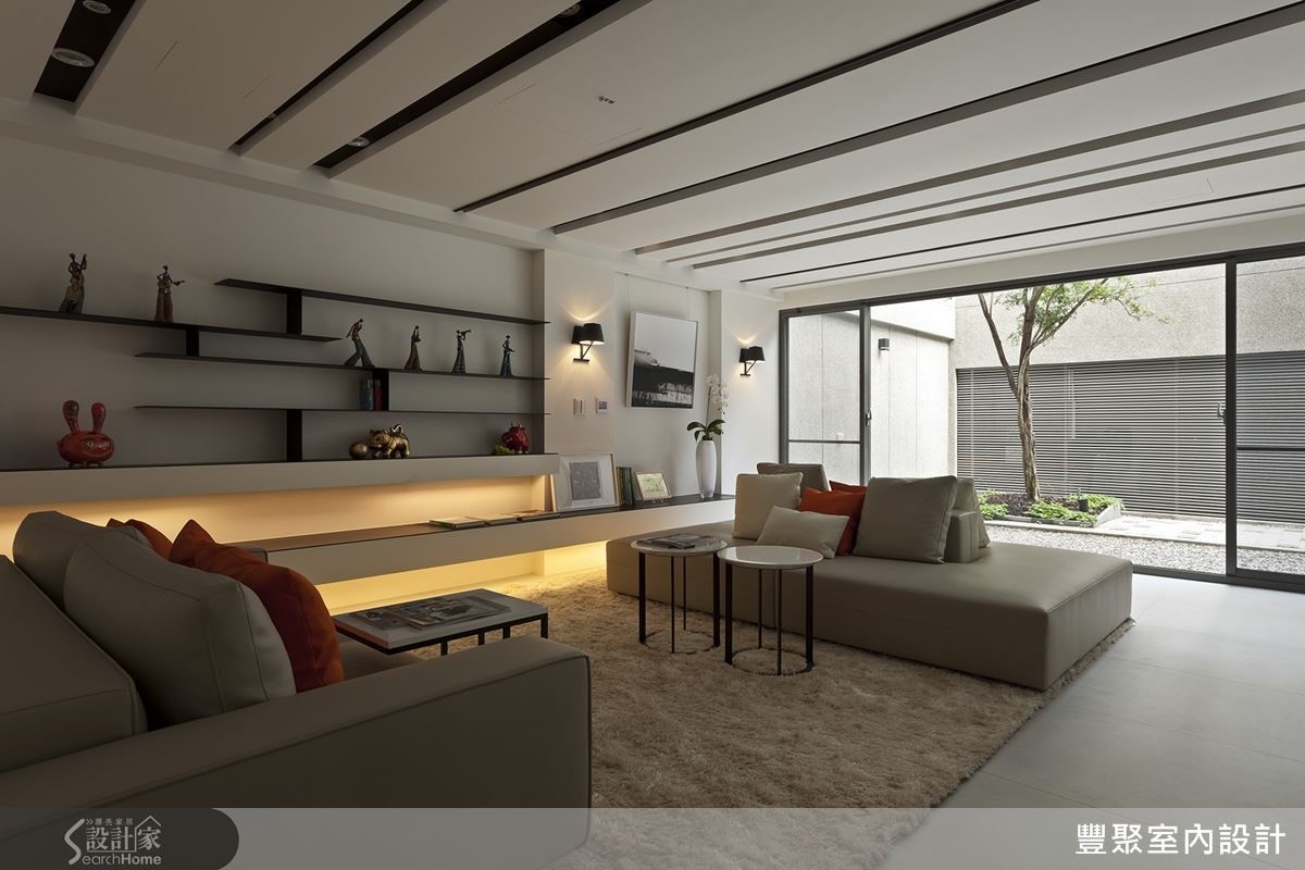 客廳捨棄了過多的裝修技巧,只有天花的線條,呼應了戶外水的延伸。牆面以極薄鐵件組成不規則層板架,輕盈不具存在感,讓藝品展現自身的特質。面對採光好有綠意的天井,設計師以單椅搭配無扶手的開放式沙發,僅以靠墊區隔,不管是與客人對談,或是獨自冥想沉澱,賞景紓壓,完全展現屋主的生活態度。