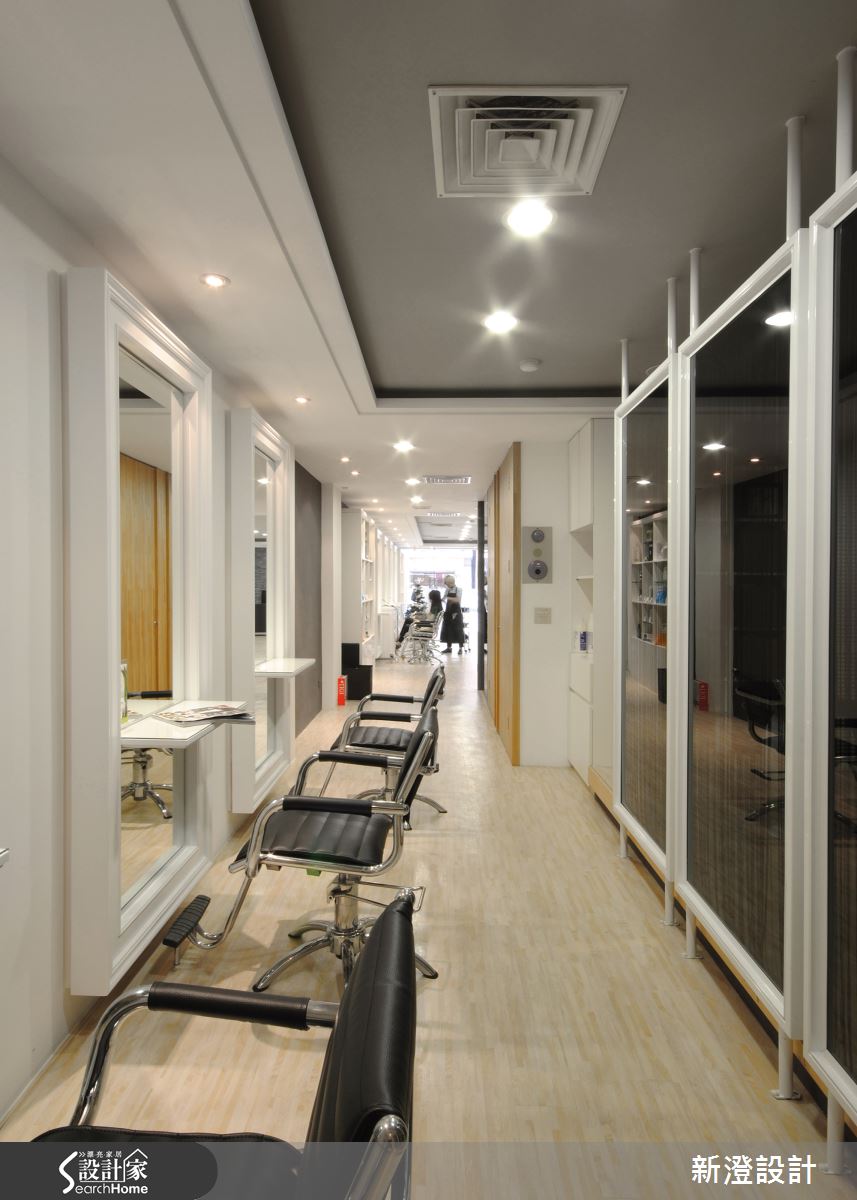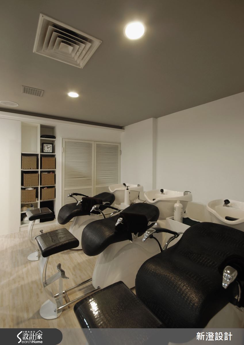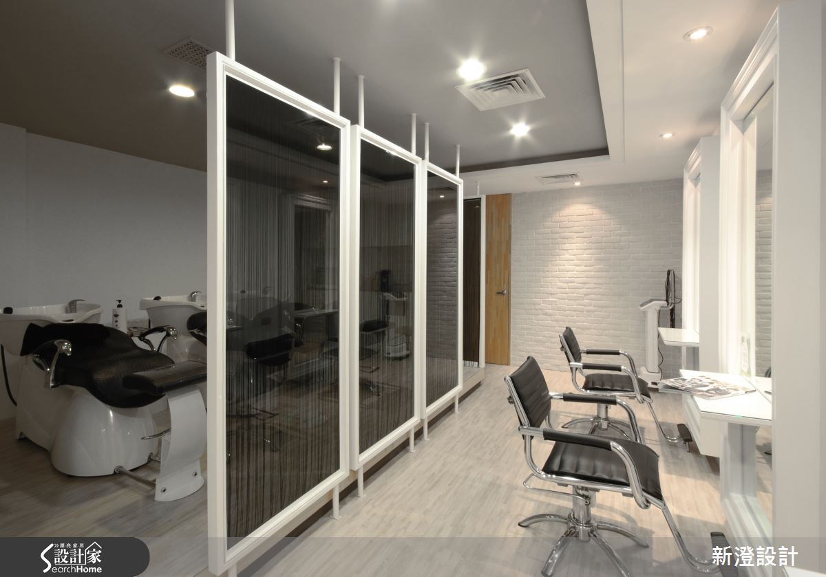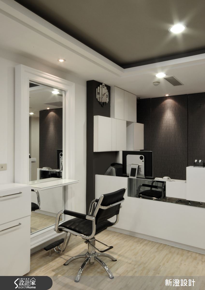 空間以黑白建構俐落調性,同時點綴清淺木色,替冷調氛圍注入一絲溫暖,整排座位區鏡面則呈現立體的框架造型,與天花嵌燈相輔相成,產生有如藝廊般的優雅視感;櫃檯區則以深色牆面為背景,藉由照明燈光彰顯壁面質材紋理,且加入錯落穿插的白色量體規劃,佐以局部鏡面材質,展現帶有前衛感的幾何風貌;洗頭區規劃了隔屏做出界定,採深色玻璃隔間搭配線簾設計,做出通透但保有分屬場域的動線,沖洗區牆面則安置百葉櫃門,一旁加入簡潔的內凹格櫃設計,在開啟機能的同時,也顯現筆直簡約的線條美感!